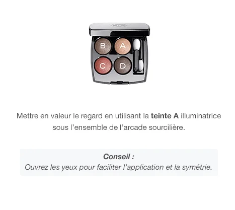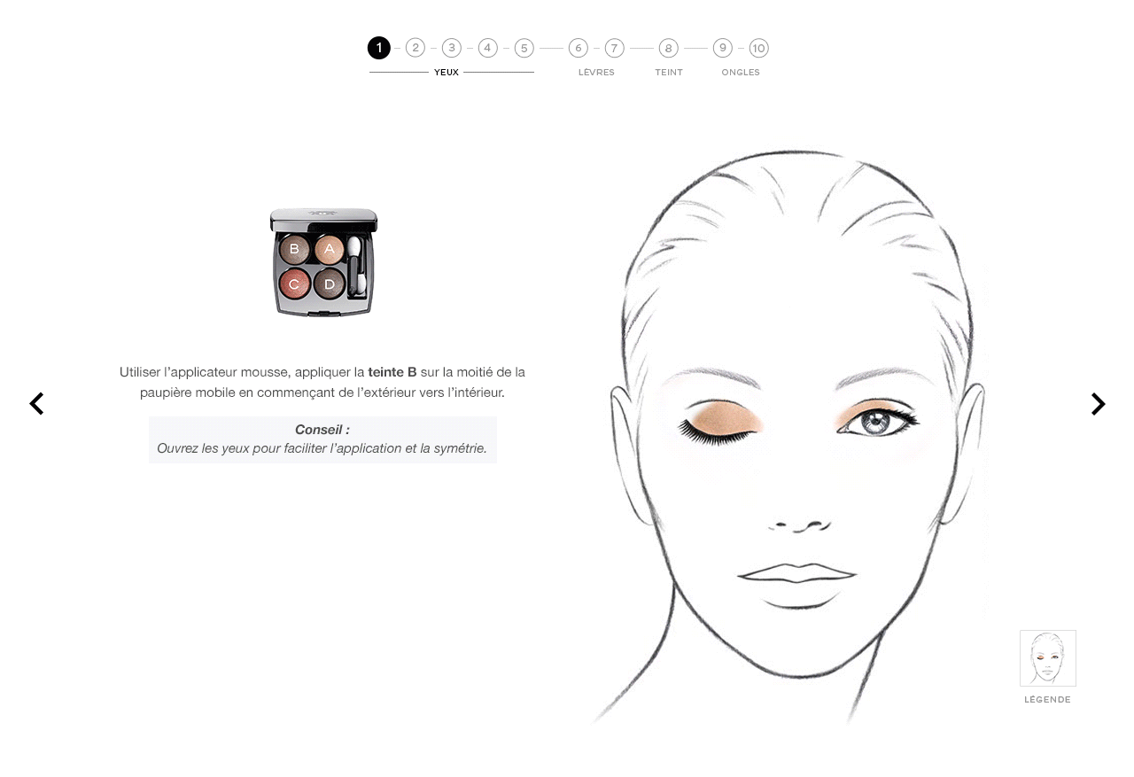 Pour chacune des étapes, un produit et des conseils associés sont affichés. S'il y a différentes teintes, suivez simplement les lettres A- B - C - D indiquées sur l'image du produit.